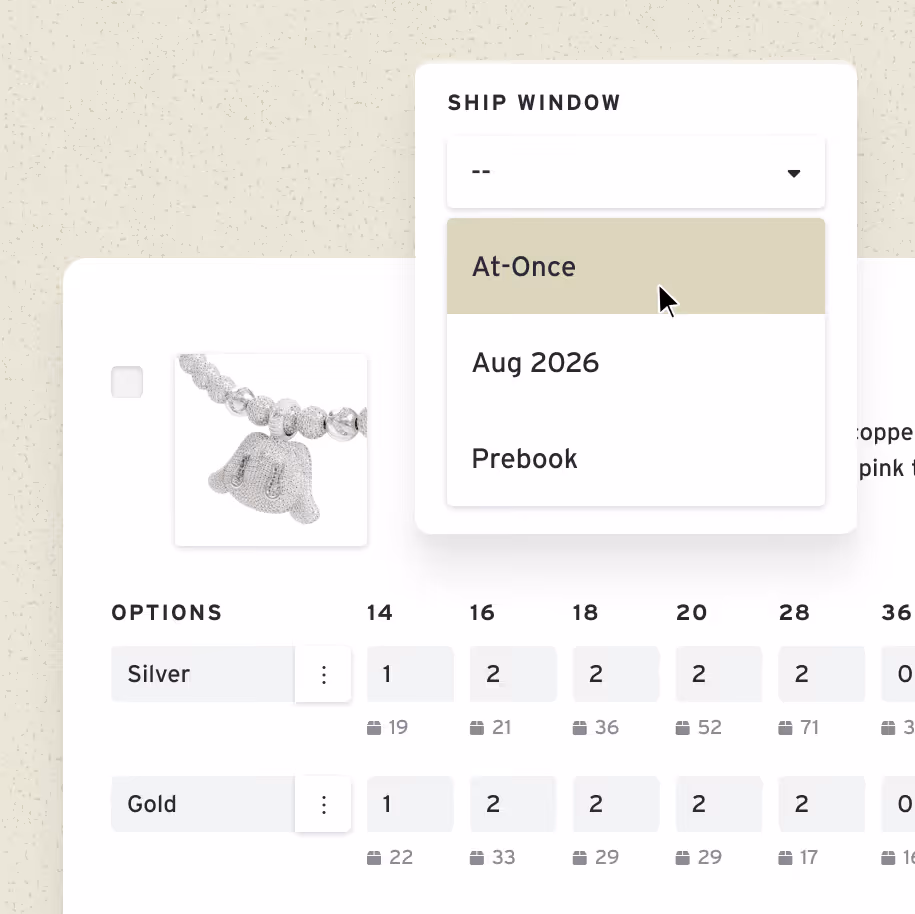See live inventory for different ship windows (multiple future Available-to-Promise inventories) — At-Once, Pre-Book, Future delivery. Reps can prevent overselling and reallocate order value to available inventory which drives an increase in AOV.